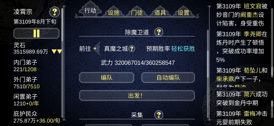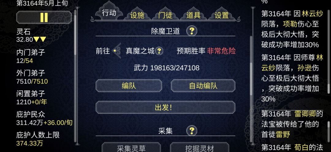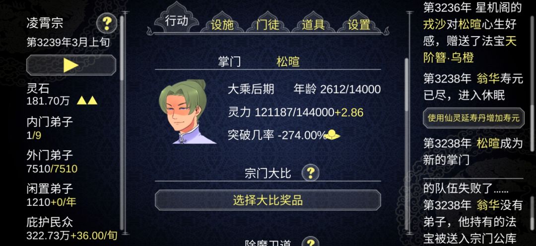 然后出了bug,有两个小强,怎么打都不掉战力,也不能收徒或写书,一个被我放逐了,另一个不小心当了掌门放逐不了,还有几十年的寿命,sl不让他突破老死了,终于剩下这样