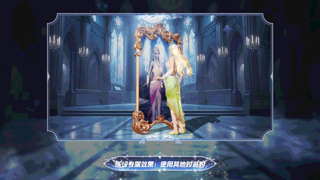 降落伞附带的陈设是通往另一个世界的门户,在这魔镜之前站立,人的倒影不再只是简单的形貌复制。使用【碎镜之心】主题时装时,镜中会出现另一个自己:使用其他时装,也会出现意想不到的不同效果。
