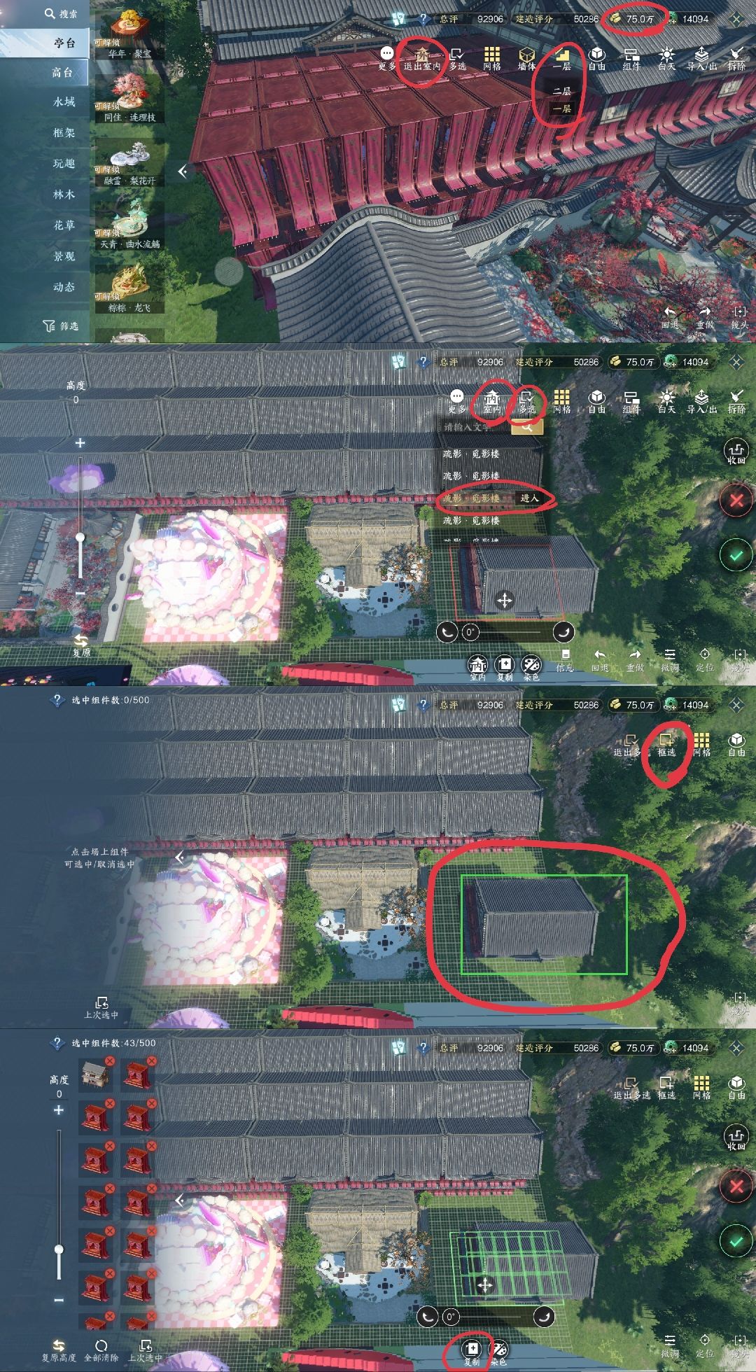 得到资材后,建造里改放觅影楼。这里有个技巧,可以进入觅影楼室内,在一二层放满架子床,然后多选框选一键复制如图四。
