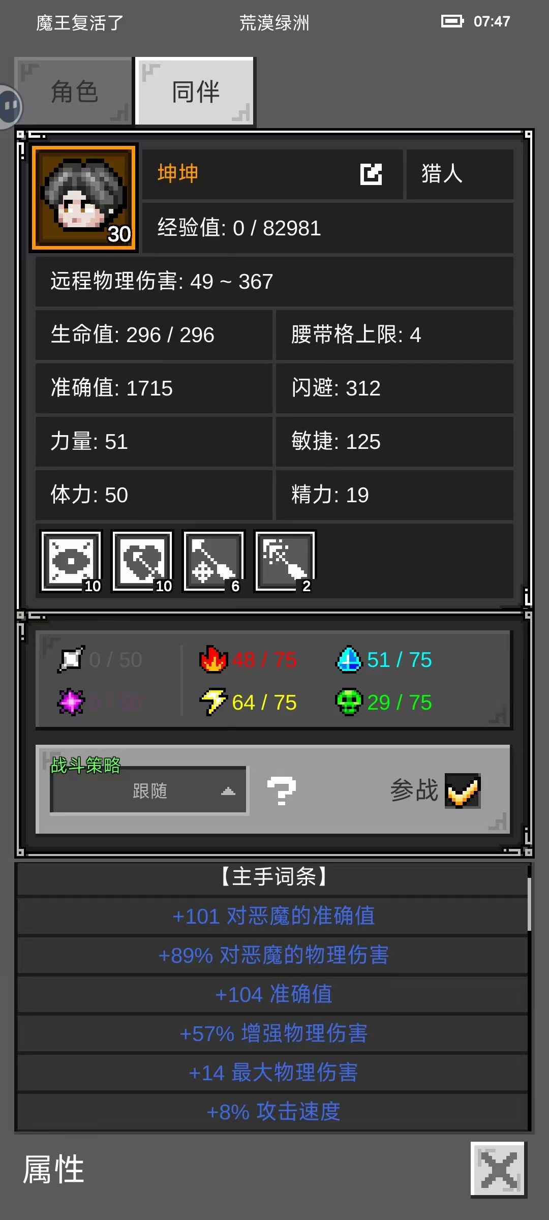 )最好,我选了两件驱魔,远程佣兵力量太低穿不上西金鞋子。
