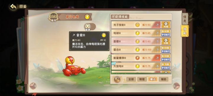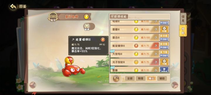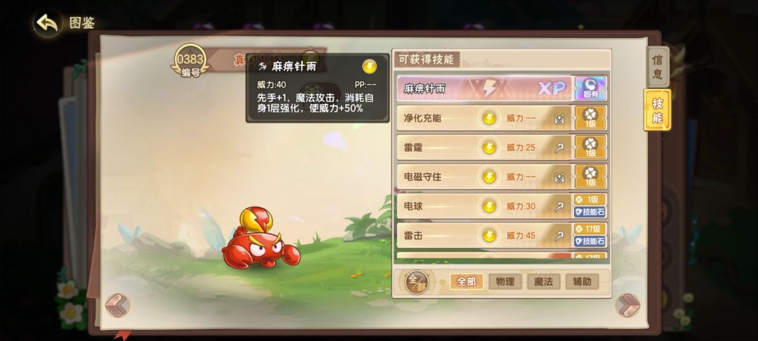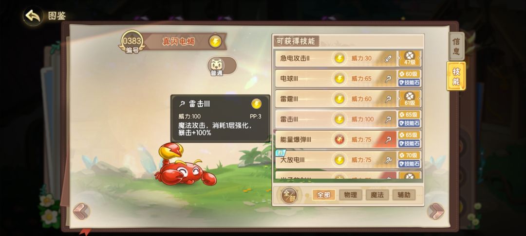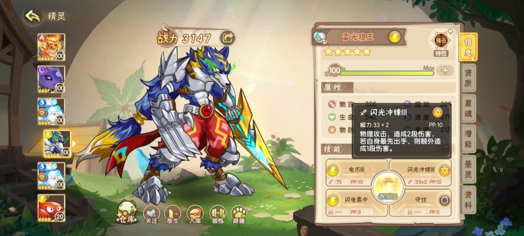 再来是闪电蝎的特性,我只能说是一坨,不管是蓄电还是激荡实际上pvp都没什么用。有人说那我用蓄电抓狼王不行吗?首先你蝎子是魔抗高物抗低,其次速度慢,再来狼王打你蝎子为什么要用电系技能?请看最后一张图。