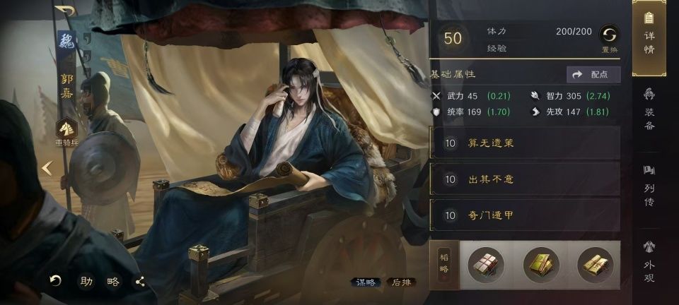 郭嘉战法:算无遗策+出其不意+奇门遁甲。韬略库:后机善本+十胜论(专属)+三听善本。重骑兵特性,专精点亮骁勇善战。身处箕形阵后排的郭嘉和鲁肃,姓氏的郭鲁谐音刚好是“锅炉”。二人临时搭配而成的锅炉重骑兵组合,因为孙权虎踞江东的加持而大幅提升了施加技穷、缴械、震慑的成功率,孙权那里也能提供火攻和技穷,这些负面状态足够把对面给整得五迷三道。
