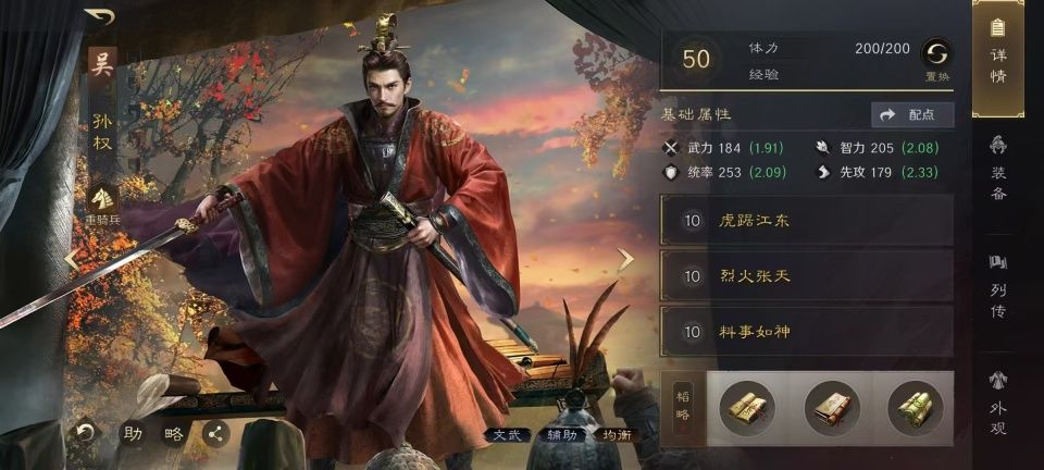 孙权战法:虎踞江东+烈火张天+料事如神。韬略库:励心善本+侦视善本+东观汉记(专属)。重骑兵特性坚韧,专精点亮骁勇善战。由于S3赛季把孙权的虎踞江东和专属金书都进行了防御方面的大幅提升,使得孙权顺理成章的可以作为箕形阵的前排肉盾为后方的队友打掩护。后续学习的两个主动战法,给全队的主动战法都带去了14%的发动率提升。