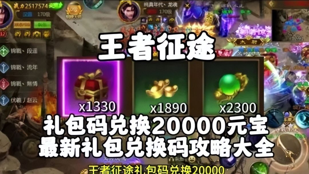 二、礼包码的重要性在《王者征途》中,礼包码是一种珍贵的资源。通过输入礼包码,玩家可以获得各种珍贵的道具、装备和金币,从而提升自己的实力,加快游戏的进程。(一)获取稀有道具礼包码中常常包含一些稀有的道具,如顶级武器、稀有宝石等。这些道具不仅可以提高玩家的战斗力,还能让玩家在游戏中更具优势。(二)加速游戏进程使用礼包码获得的金币和经验值,可以帮助玩家快速升级,提前解锁更多的游戏内容和功能。(三)提升游戏体验一些特殊的礼包码还会为玩家提供独特的皮肤、称号等,让玩家在游戏中展现出独特的个性和魅力。