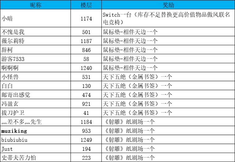 恭喜以下幸运玩家中奖!辛苦各位玩家在七个工作日内添加联系方式QQ:2168413763,兑换奖品哦~(7个工作日内没有联系工作人员视为放弃奖励)