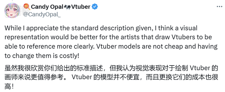 相较于多穿一件衣服即可解决问题的真人主播,虚拟主播通常需要花费额外的时间与金钱成本对自己的形象做出符合规范的调整。然而问题在于,Twitch给出的标准不够透明清晰,一些 VTuber请求Twitch公布一张直观的视觉图片以供参考,可最后等来的只是官方账号发过来的大段模糊不清的文字说明。