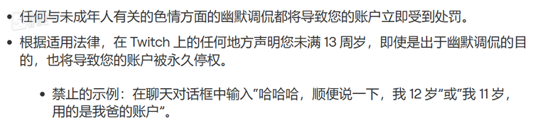 当然,严厉禁止儿童色情是Twitch一直在做的事,这次不过是干劲利落地切割一切有可能涉及未成年性暗示的直播内容。即便是半开玩笑地说自己未满13岁,Twitch也会立马采取封禁账号的处理。
