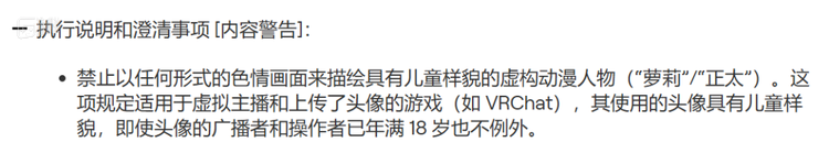 首先是“青少年安全”部分,Twitch将禁止“以性感的形式描绘看起来像儿童的虚拟动漫角色”。在相关说明中,Twitch干脆直接点名了“萝莉”和“正太”这两类二次元常见人设,就算这些纸片人背后的主播已经成年,Twitch还是不希望涉及幼态审美的性暗示内容出现在他们的直播间里。