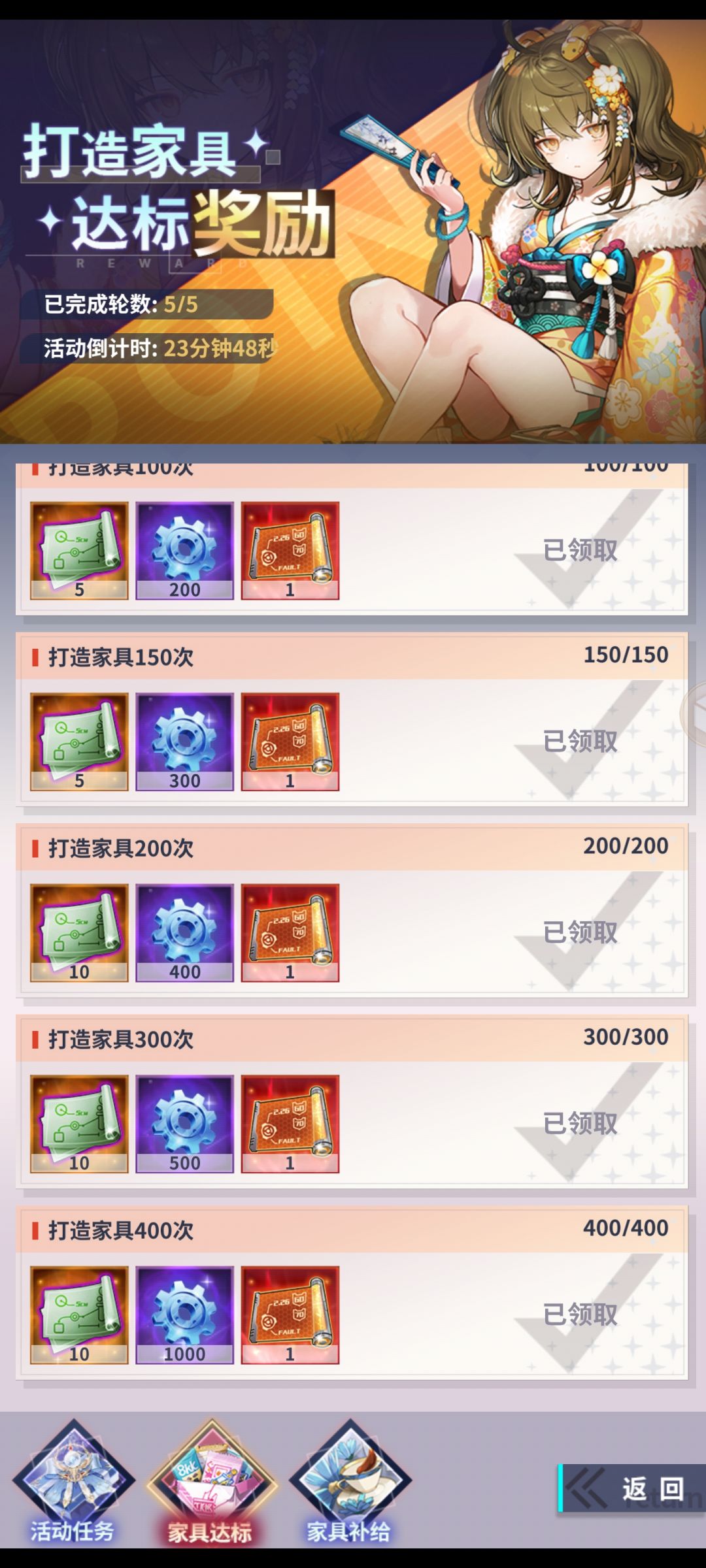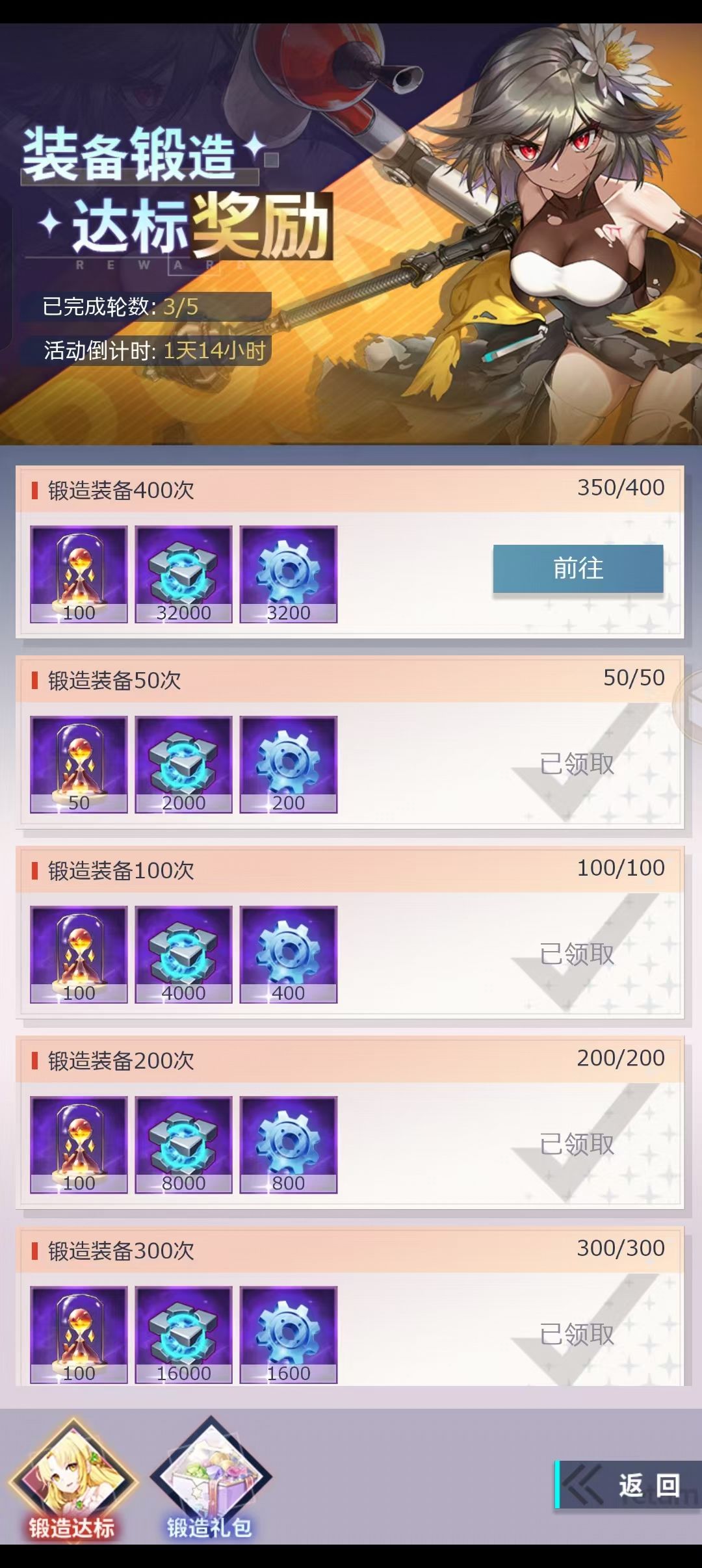 开服第八天之后会有一个装备锻造活动,大家前面不卡关的情况尽量留资源等活动的时候在锻造装备完成锻造装备活动能获得大量载具升级材料,并且关卡打到越后面锻造的装备等级越高,在锻造的时候也千万不要忘记材料够了先升级锻造炉,锻造炉等级越高可以锻造出的装备品质也越高,我就是前期没有攒多少锻造材料的亏只能完成第四轮锻造。