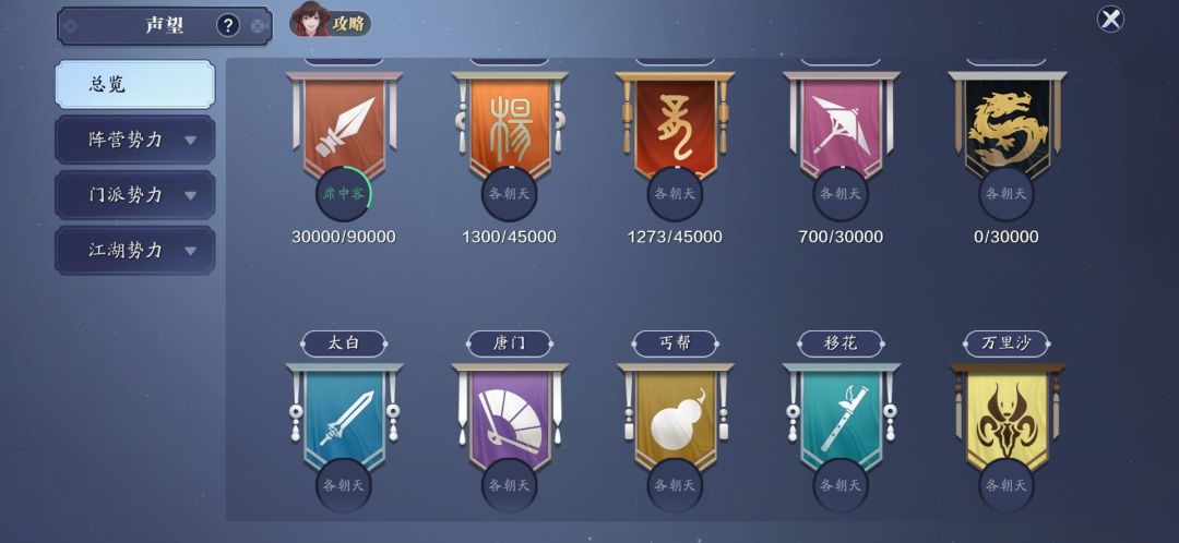 江湖势力则有天波府、龙首山、万里沙和雪衣楼四个,除了声望商店的奖励不同之外,其实几个势力的声望倒是没有太大的差别。
