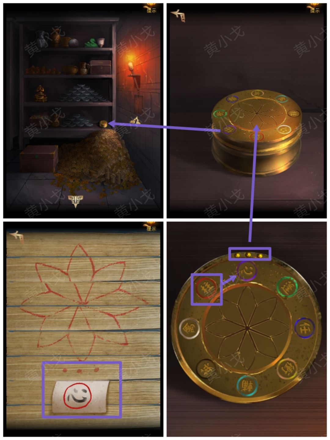 ⏩️点击第四层柜子上的金色盒子,根据盒子上的花瓣图案和书上的信息,调整盒子上的机关(红心对准三个点)