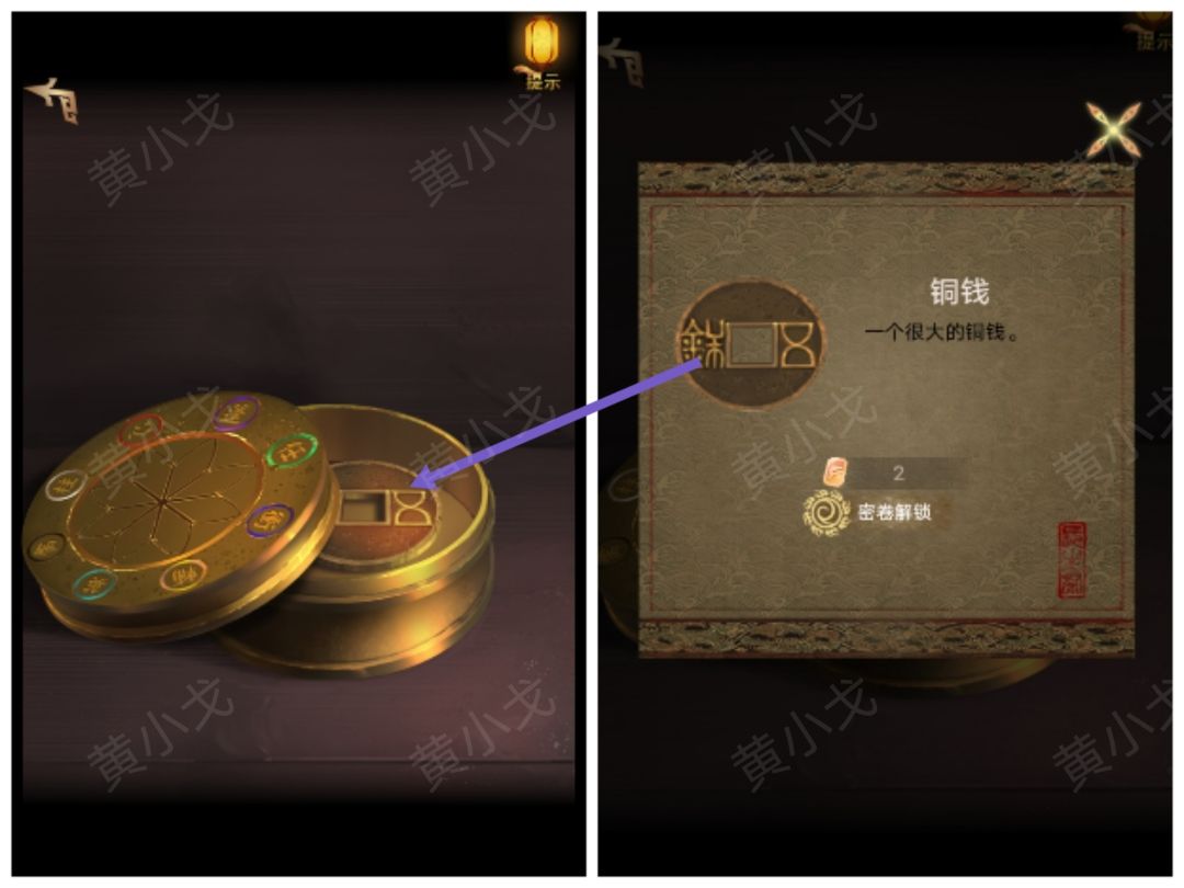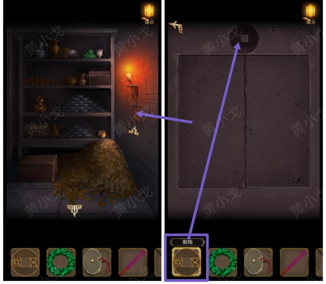 ⏩️点击火把下方的暗格,把【铜钱】放入凹槽处