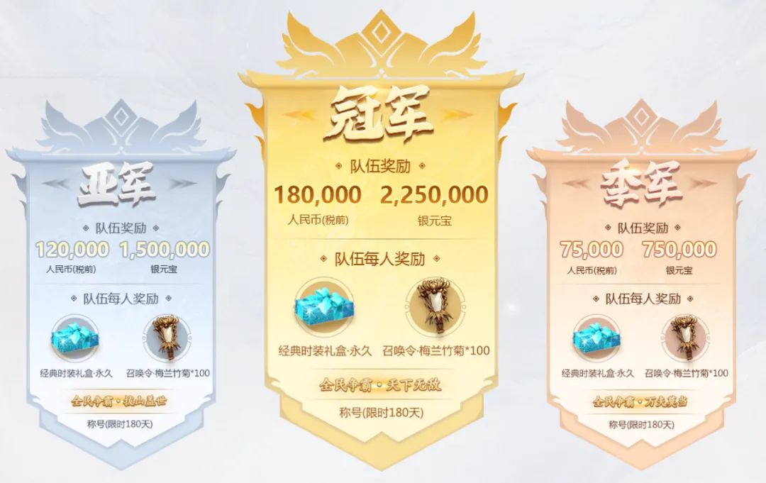 只要参赛即可带走参赛礼包,现在报名人数已解锁最高奖励档位,获胜1场就有价值2894元宝礼包到手!(*2894元宝为参赛礼包+获胜1场礼包价值总和)还有机会瓜分150万奖池,冠军甚至可带走18万现金大奖!