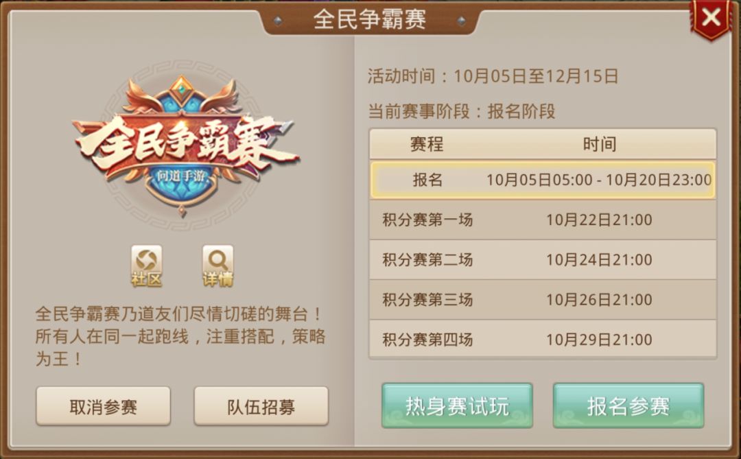 全民争霸赛报名仍在进行中!在10月20日23:00前,道友们都可以前往天墉城,寻找跨服赛事接引人进行赛事报名哦~