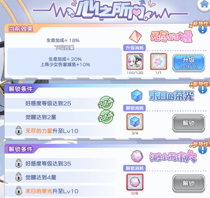 - 升级心向有核心、好感度和星级要求