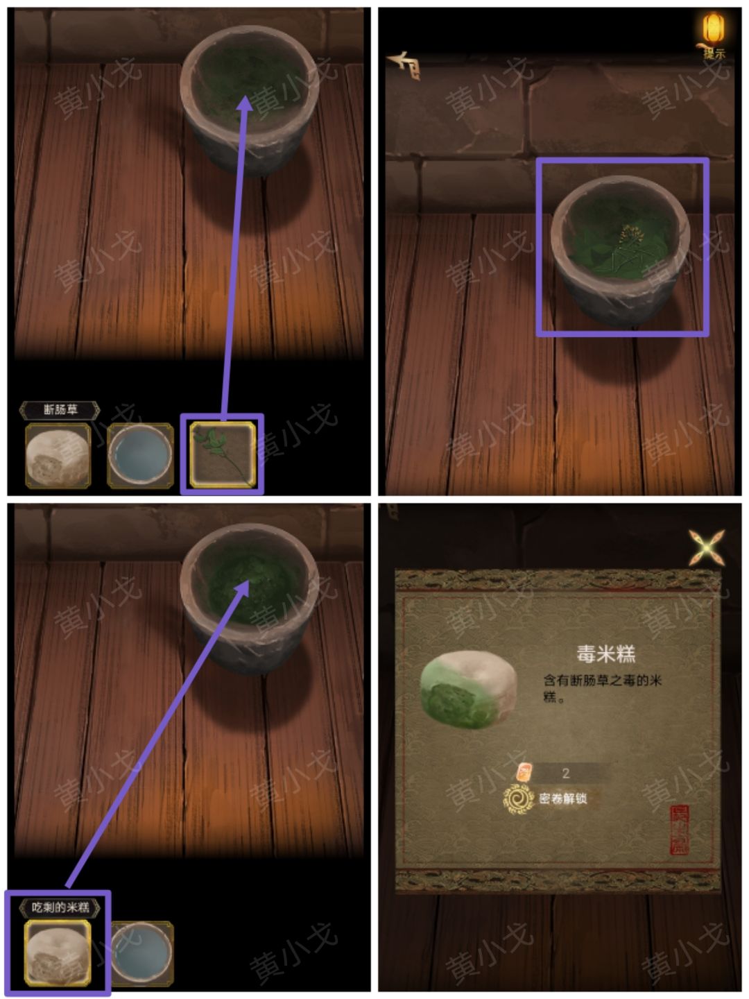 ⏩️把【断肠草】放入桌子上的捣药罐,点击捣碎;再用【吃剩的米糕】蘸断肠草,获得【毒米糕】