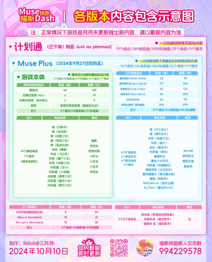 本图用不同颜色展示游戏本体/Muse Plus/计划通各自包含多少曲包和附赠内容,三者为包含关系。