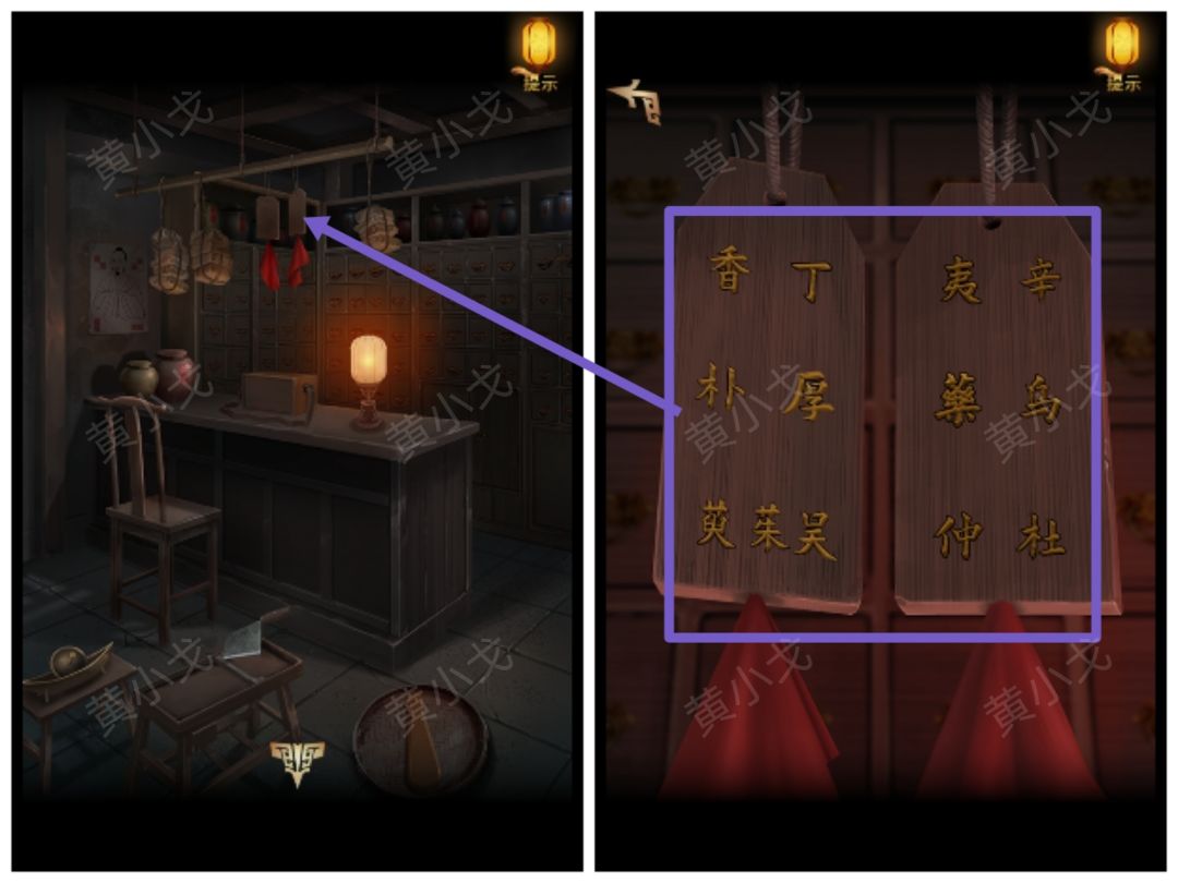⏩️根据木牌上的线索(药材的位置),结合书上的线索(药材的名字和外形),调整滑块至正确位置