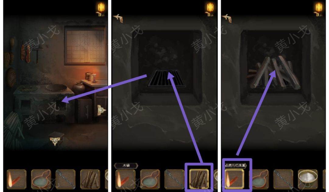 ⏩️点击灶台右上方的灶孔,放入【木柴】,用【点燃的蜡烛草】点燃