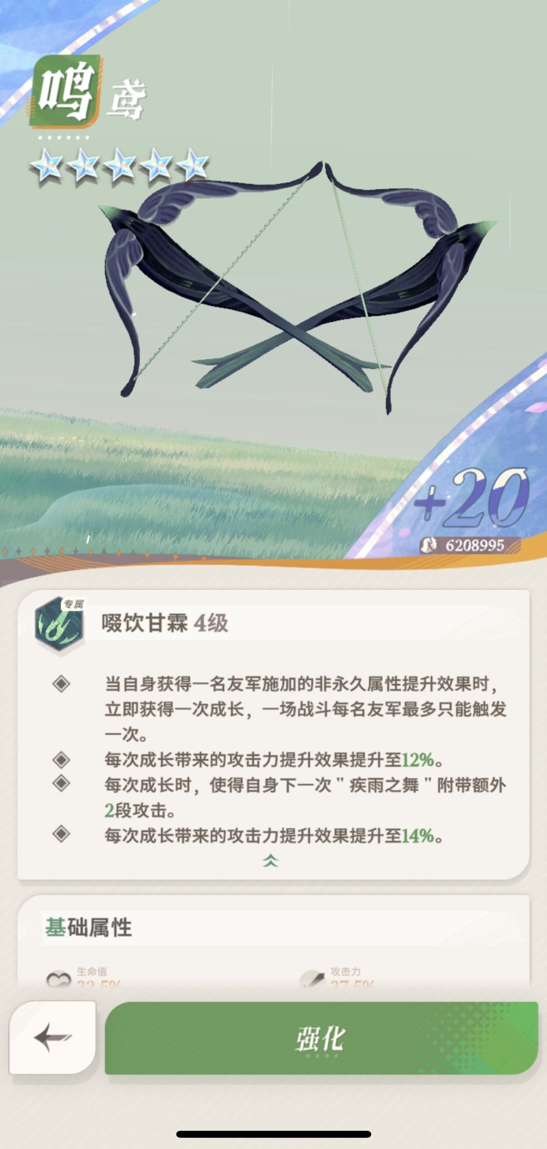 5.英雄专武啜饮甘霖小舞觉得有必要升到四级,每次成长都会提高14%的攻击力,还会增加两段疾攻击的雨之舞。