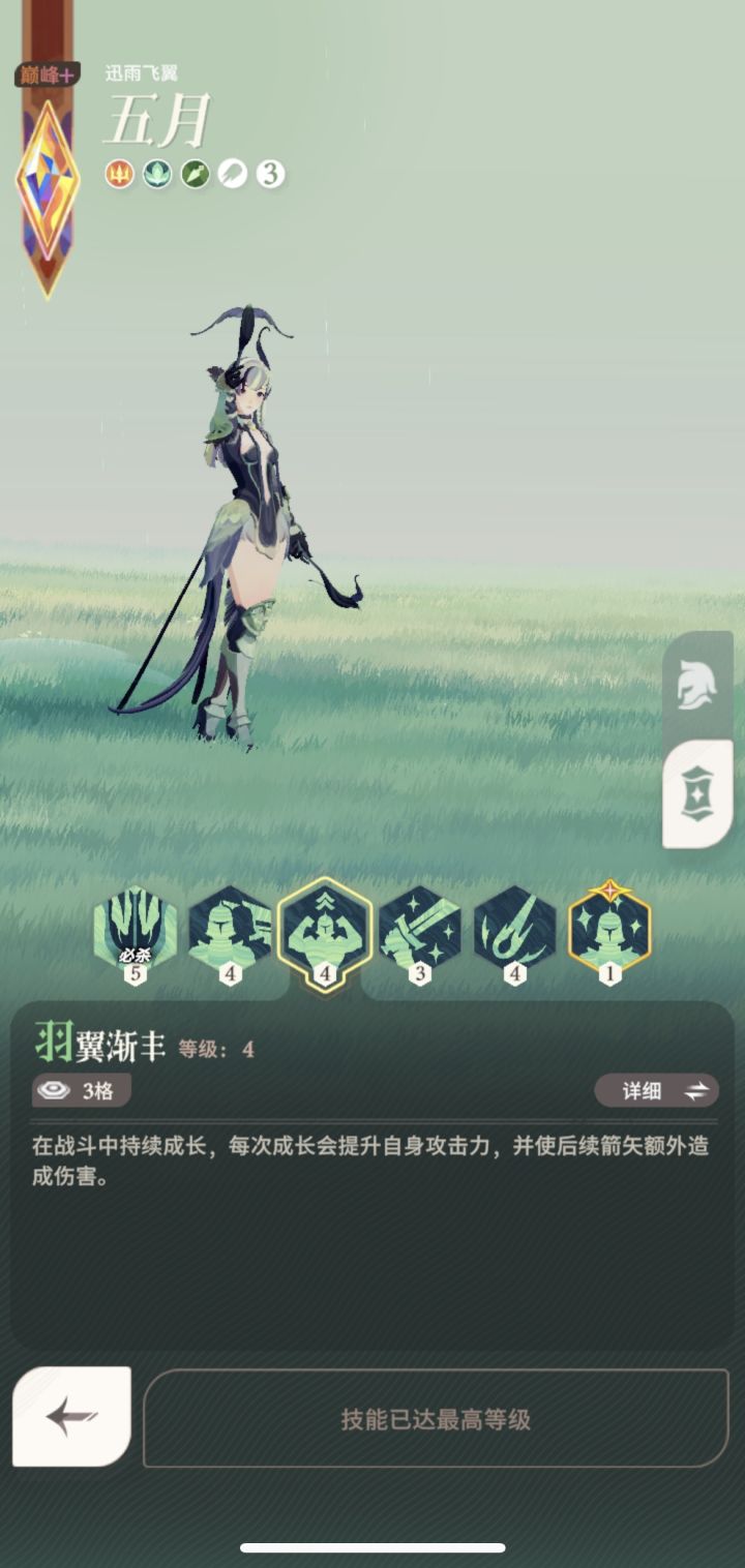 3.羽翼渐丰“在战斗中持续成长,每次成长会提升自身攻击力,并使后续箭矢额外造成伤害”,这个技能配合专武啜饮甘霖会让自身的攻击力不断提升,造成巨额伤害。