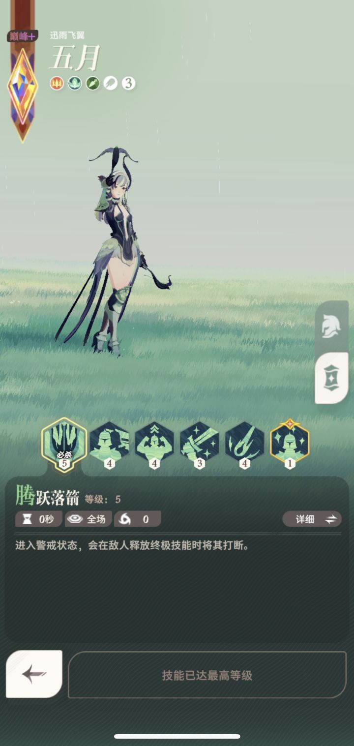 1.必杀技腾跃落箭“进入警戒状态,会在敌人释放终极技能时将其打断”,这个是埃隆的超级克星技能,埃隆作为竞技场最主要的控制大师,就是因为其开场就可以放出大招,然而被五月克的shishi的,这个技能使五月在竞技场有了立身之本。