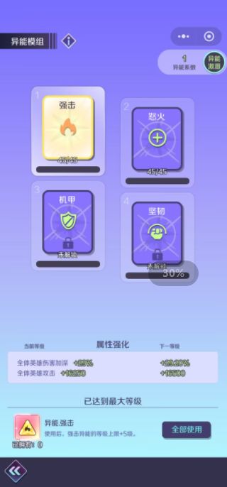 异能模组分为四个模组:强击、怒火、机甲、坚韧,每个模组根据主线阵容中的五个英雄总星级之和解锁。每个模组依次解锁分别需要5个上阵英雄总星级之和达到40、50、60、70星,每个模组解锁时都可以提供大量全体英雄属性和战力提升。