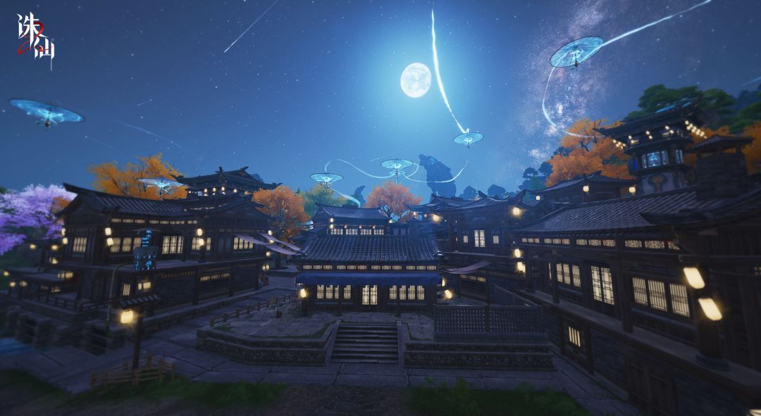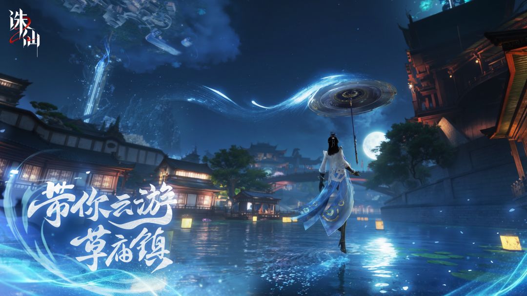 新的草庙镇傍水而建,房屋错落,鸡犬相闻,青石白阶与水道交错。在游戏内光追技术与高清反射效果的加持之下,河水在阳光的照射下泛着粼粼波光,远处的山峦翠柏、近处的屋舍桥梁倒映水中,每一处光影折射之间都渲染出如诗如画的环境氛围,仙友们仿佛置身于一幅意境悠远的画卷之中。