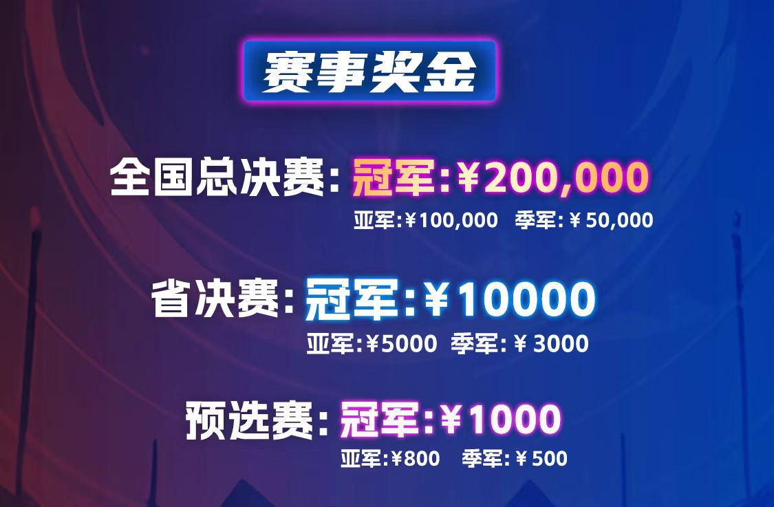 参与预选赛,冠军可获得1000元奖金,省决赛冠军奖励10000元,获得全国总决赛冠军,将获得奖金200000元,全国赛事奖池近100万元!