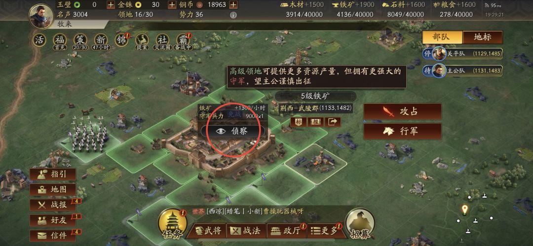 前期主要任务是不断升级城建,增加作战属性,可以跟着任务来做。而升级需要各种材料,可以根据当前队伍的实力,选择合适等级的资源地进行攻占,攻占后可以获得对应资源,如果没有把握,可以派侦察兵侦察,然后根据兵种克制关系,派相应的兵种攻占。
