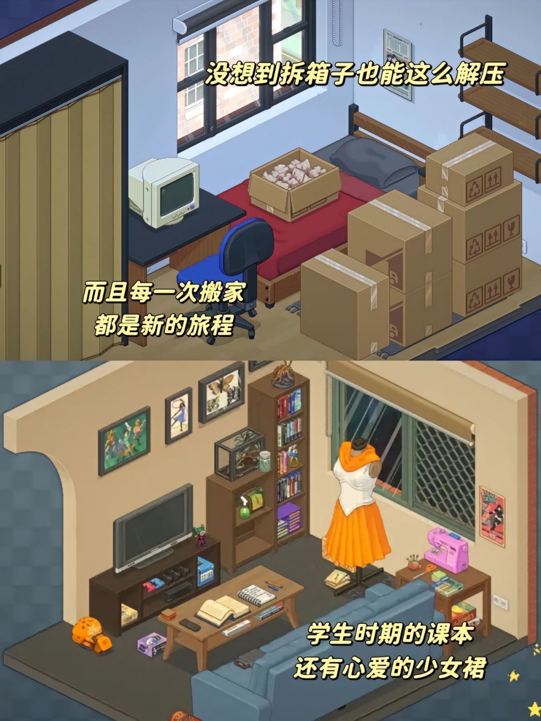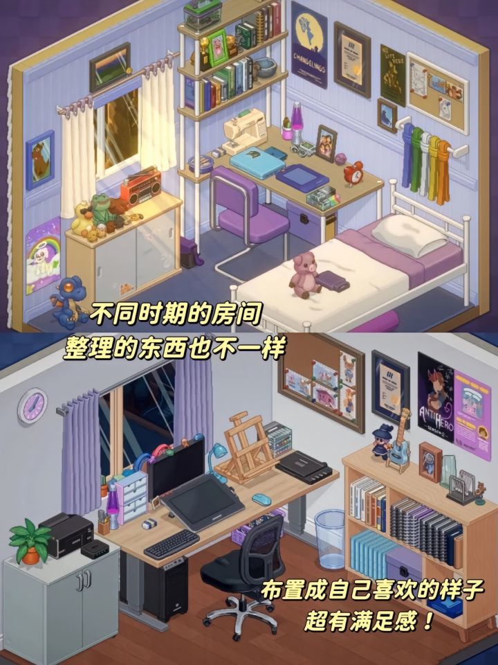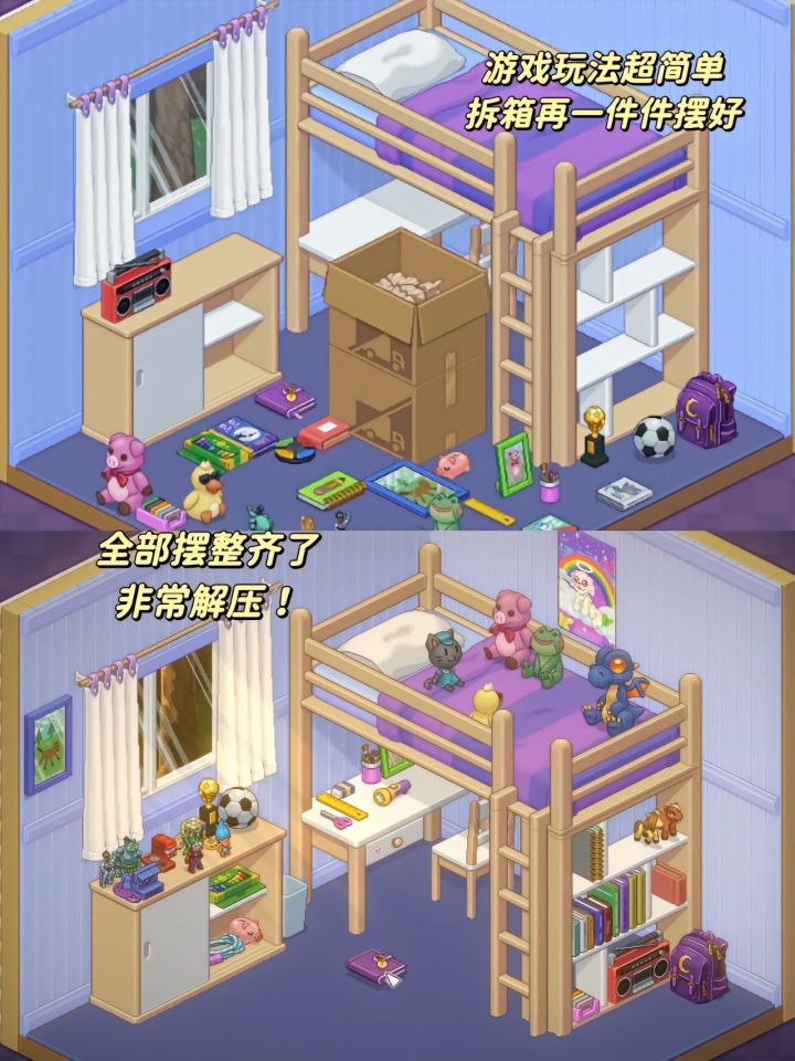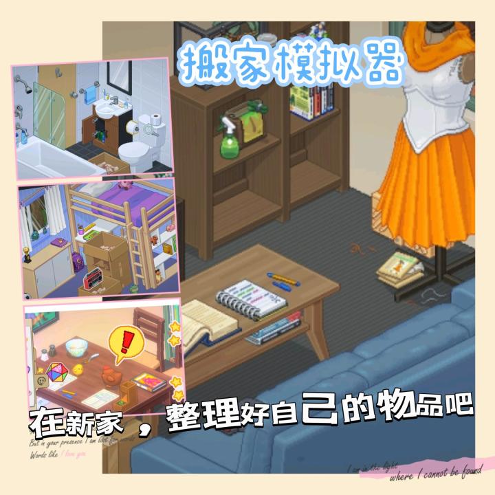 游戏主要是围绕搬家收拾行李,通过数次搬家,将每次的行李从箱子里拿出来整理并且装饰房子!