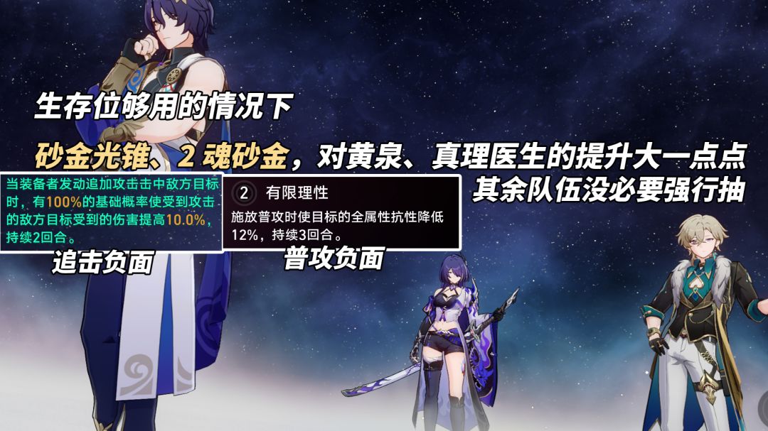 【已有砂金还想继续加配】①砂金光锥、2魂,使其攻击时有更多负面效果,适合黄泉、真理医生队伍考虑,其余队伍没必要刻意抽取,提升不明显;②砂金1魂,进一步降低砂金放战技需求,缺点队伍可考虑。