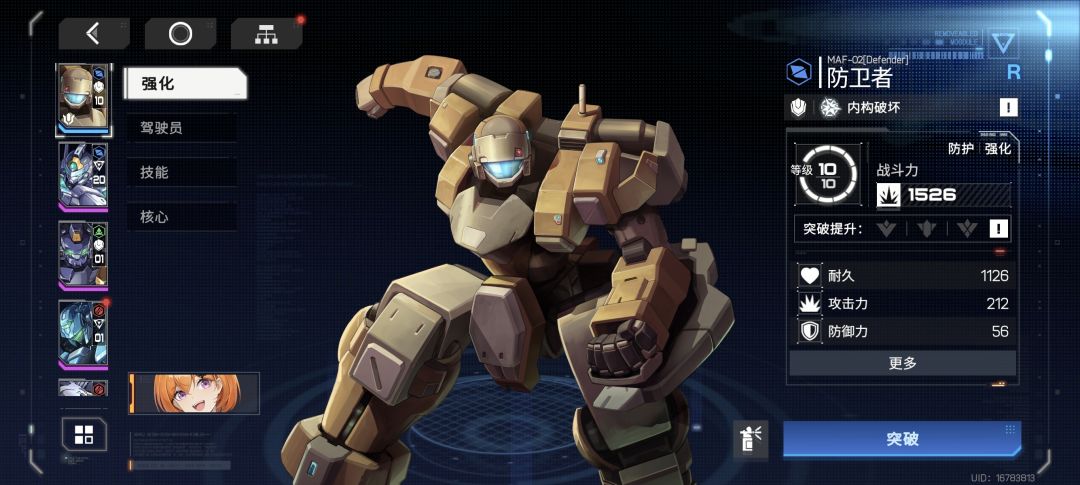 好奇也是正常的,因为他只是一张R卡,对于很多玩家来说,官方的这次送的福利足够抽出很多好机甲,最次也能有几个SR,何必去关心一个R级卡,如果你有这个想法就大错特错了,正因为他是一张R卡所以他很好抽出重复的,而他的核心升级可以轻松到6阶段,而6阶段的时候就可以让在掩体周围的友方攻击力提升30%,并且掩体被摧毁时还可以提升50%的防御,属于是一张辅助能力非常强的卡,这张卡他的技能可以提供掩体,而且可以让掩体最多存在3个,所以这套阵容就是开局防卫者提供掩体,然后弧光来进行远程消耗,就可以完全不用担心远程的进攻,而达姆拜尔直接砍就完事了,因为它可以造成瘫痪,而弧光是【借机攻击】又可以接着延长瘫痪的的时间,而达姆拜尔死了,还可以留下【新夜帷幕】让脚下的友方机甲每秒回复2%,这时候你在用防卫者在脚下放个掩体,就成了又能打又能回,达姆还可以复活,所以过关就非常轻松。