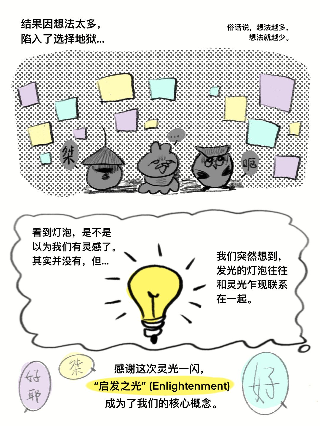 在一片沉默中,我们突然有了一个另辟蹊径的思考视角。在我们当下的社会文化往往使用”一个点亮的灯泡“表示想出了好点子。上世纪的黑白默片电影《菲力猫》被普遍认为最早使用这一手法,然后被沿袭至今。