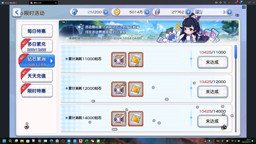 然后钻石累销,需要消耗1w-4w钻石不等(要看卡池的类型,如本期的混池就是4w钻拉满的)
