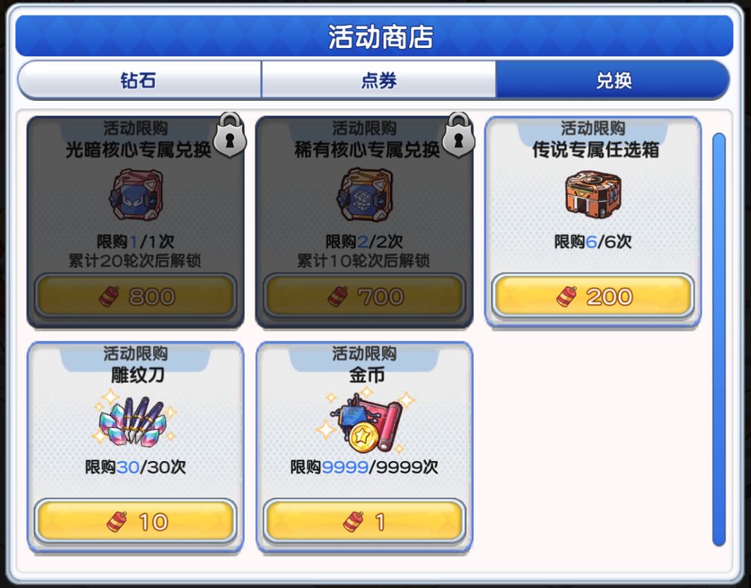 最后是兑换商店,需要用代币兑换,分别有:光暗专属核心兑换,稀有核心专属兑换,传说专属任选箱,雕纹刀,金币。限购1/2/6/30/9999次。价格分别为800代币/700代币/200代币/10代币/1代币。