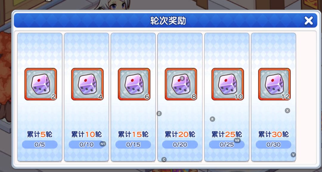 第一个轮次奖励,里面分为5轮,10轮,15轮,20轮,25轮和30抡。每达成一个目标会奖励2,4,6,8,10,12个骰子