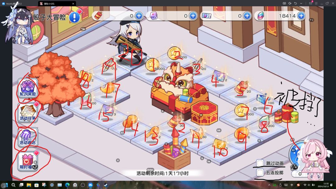跳过动画,毋庸置疑,跳过那长达2~3秒的小动画,五连投掷实则是一次投五个,按蓝背景白骰子按钮,就可以投掷1/5个骰子了,每轮共计20步,回到起点即为计入一轮