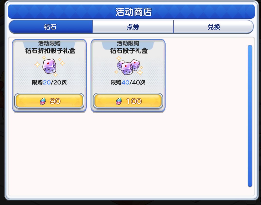 来到第三个界面:活动商店,钻石商店中有2种礼盒:钻石折扣骰子礼盒和钻石骰子礼盒,总计限购20/40次,价格为90钻/100钻,累计可拿20+40=60个,共计消耗20*90+40*100=1800+4000=5800钻