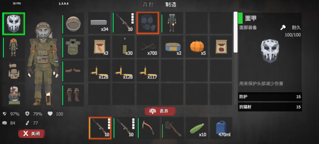 提醒一句,前期神装防辐射服就隶属于身体部位装备,其不仅低成本自成一套,获取途径较大,可以通过开启普通资源箱获取也可自行制作,防辐射服提供的抗性和防御相对较高,前期必备