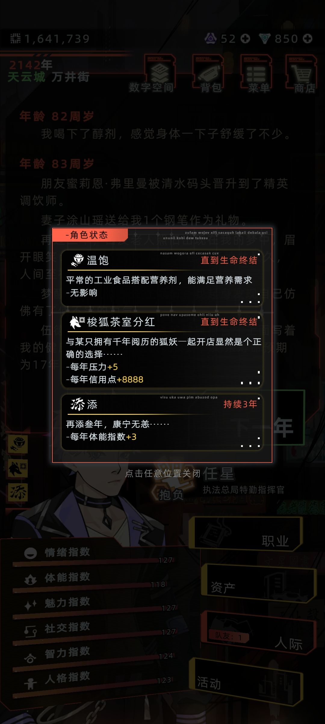 大概77左右触发第一个,数值必须拉满差不多尤其是体能。每一个buff三年,最后一次buff就是海屋添寿。