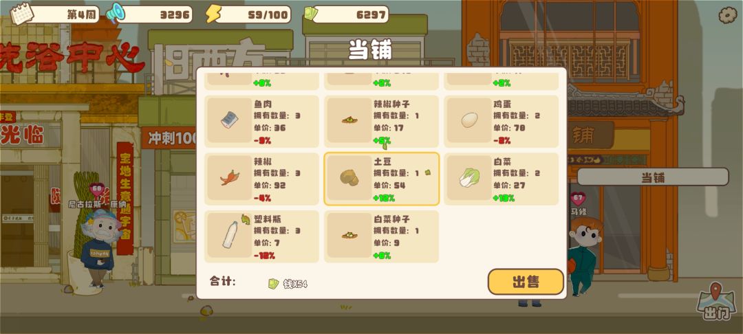 厨房可以做菜,每道菜都有要求,菜可以从垃圾桶获得,可以自己在菜园种菜获得,可以在便利店购买获得。便利店买的越多,开放的越多,可以买到新的菜谱,也可以购买鱼竿去码头钓鱼,码头不定时开放,所以开放的时候最好多钓鱼,美味清蒸鱼每次一用还是很划算的,蚯蚓在地图随机出现,不用买5行动力可以随机挖到1-3条,码头不开放时候可以去当铺看看,每次必看,因为价格会不一样,有增幅就可以卖掉