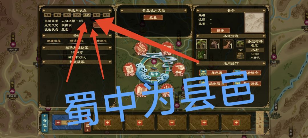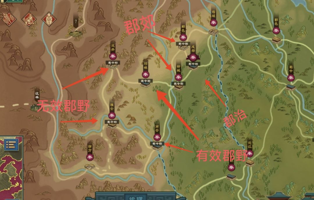 3.城邑的基础人口上限越大,越适合作为有效郡野,郡郊次之,因为作为有效郡野能给多个郡郊加人口上限,作为郡郊能给郡治加人口上限,而作为郡治什么都加不了。这一点与实际有出入,玩家喜欢把大城作为郡治,但事实上这样的收益是最低的,把大城作为有效郡野还能抵消掉一部分郡县制影响人口流动,降低人口增长速度的debuff