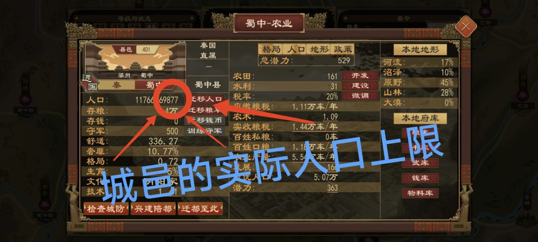 这里必须引入城邑的基础人口上限这个概念,城邑的基础人口上限无法直接得出,必须通过计算的方法才能得出,具体计算方法会在后文给出