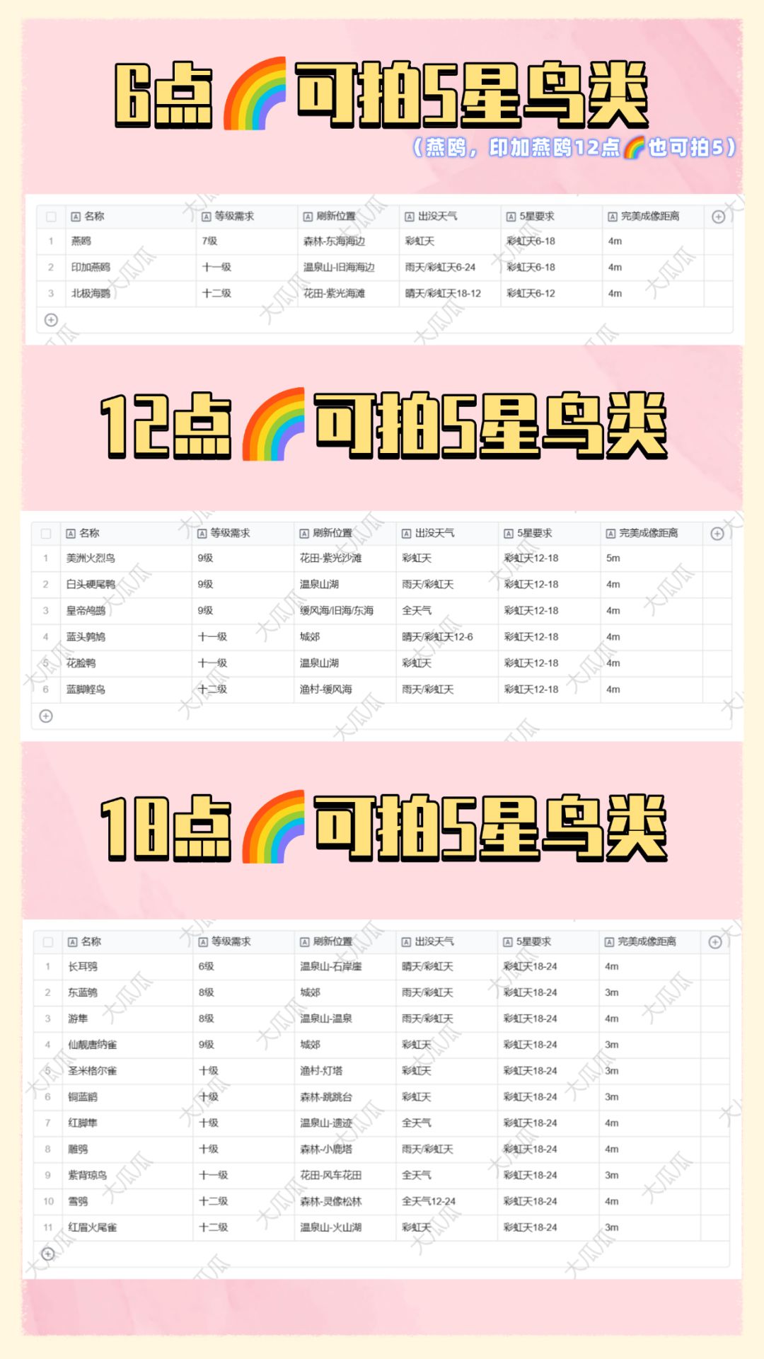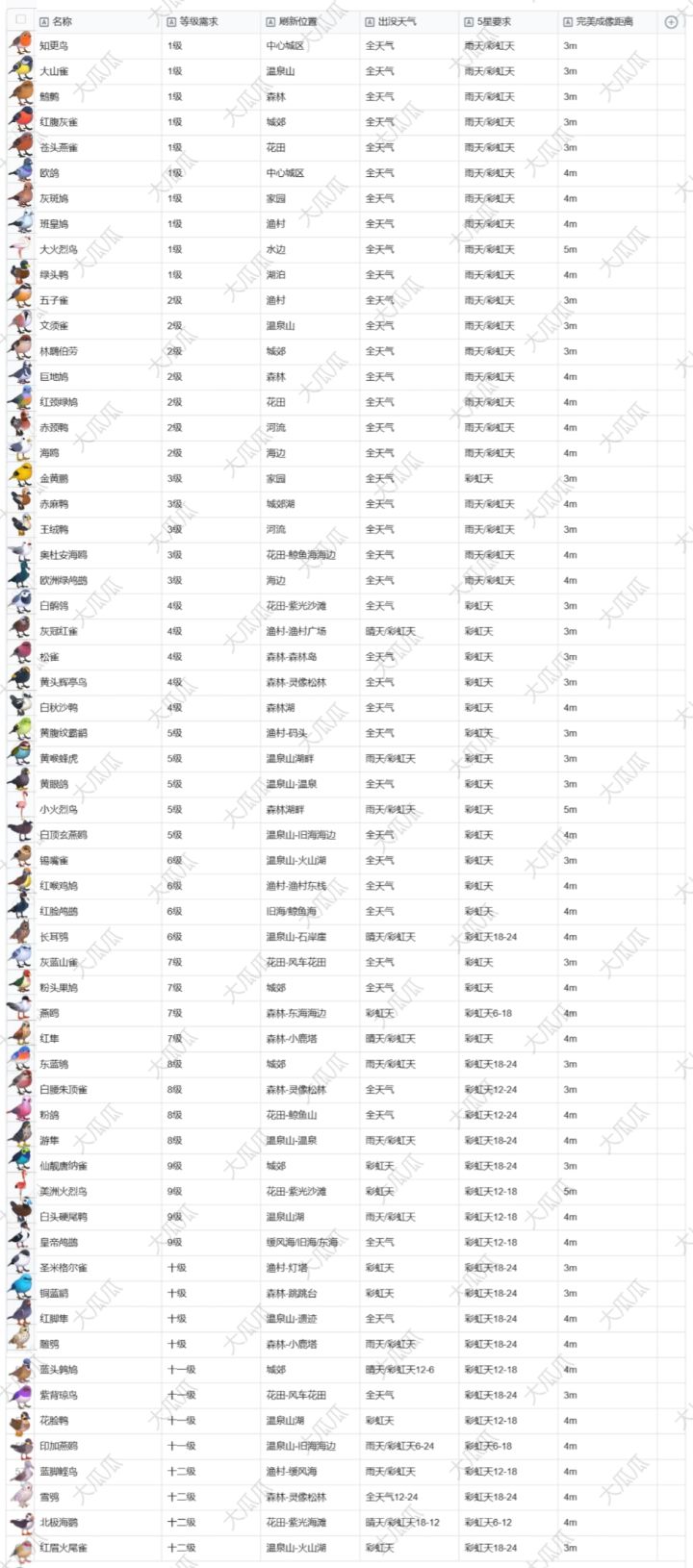 注意:雨天1-3级鸟类0-6拍不到5星动作,甚至3星都难拍是所有鸟。(除非用道具)
