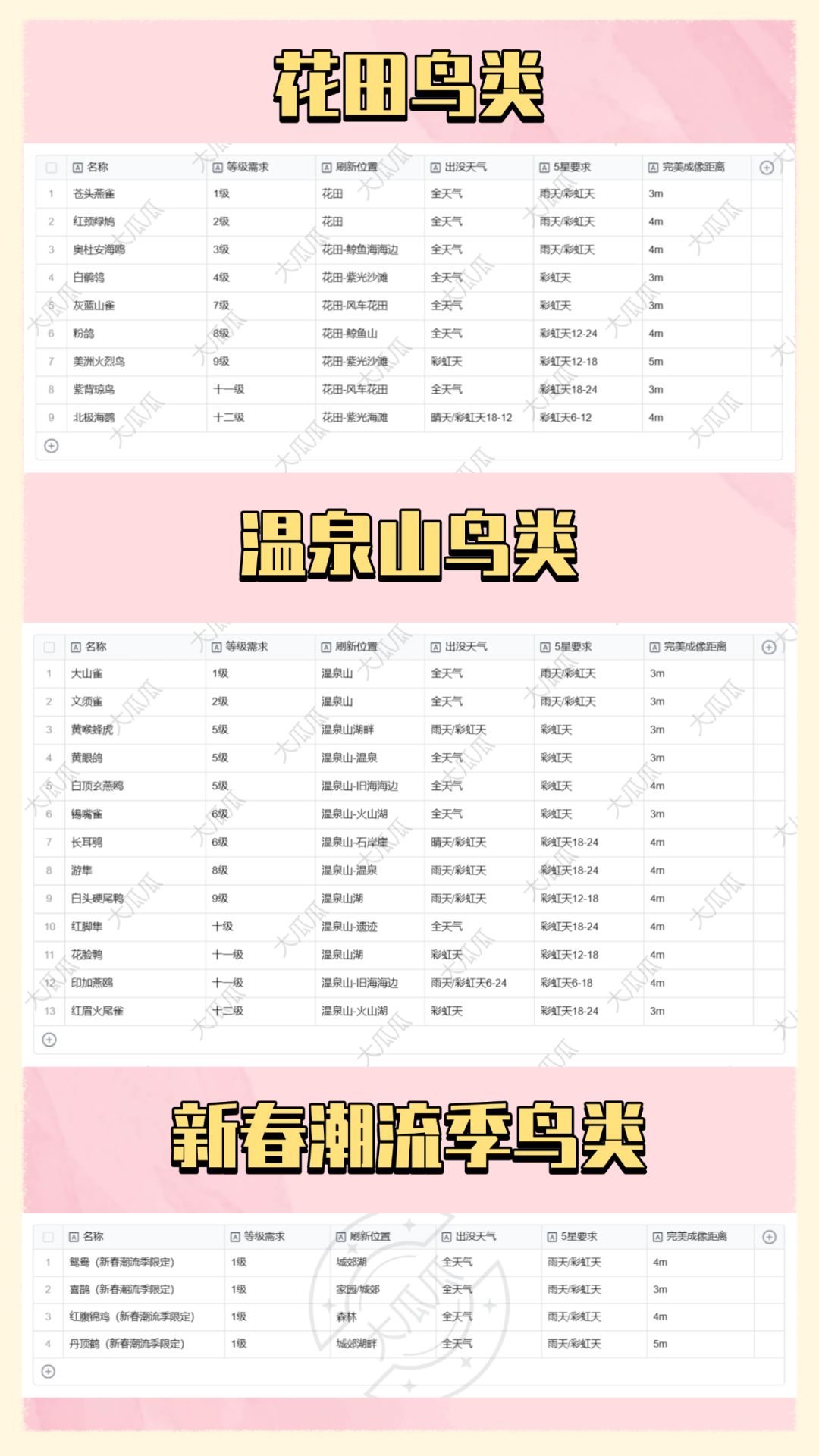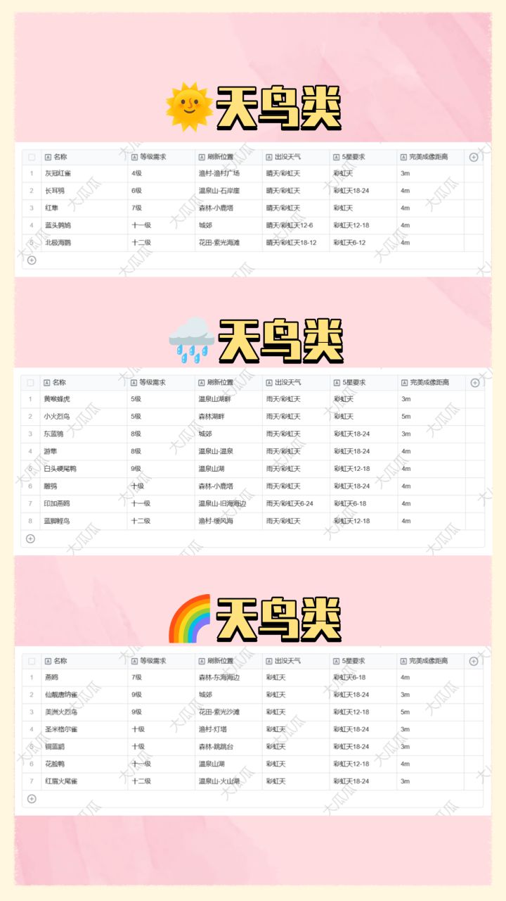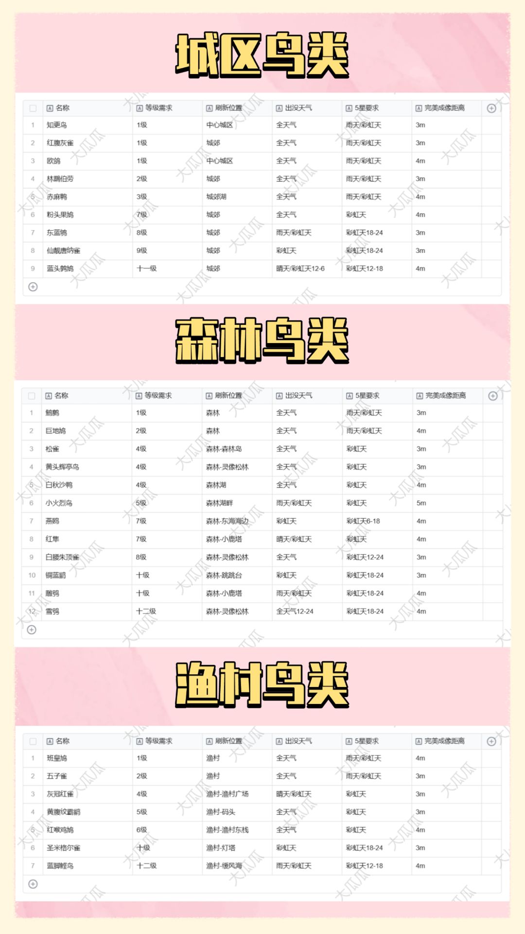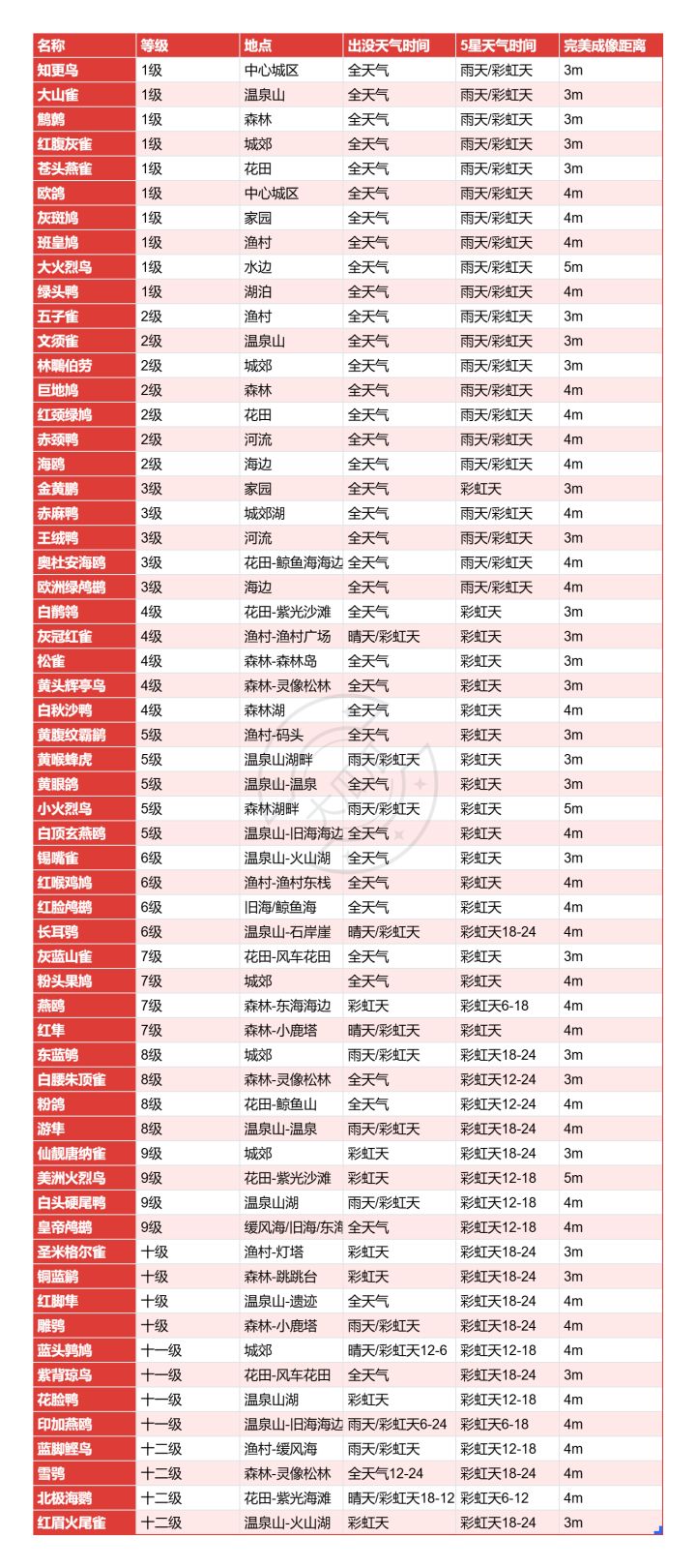 1-12级文字版已全部更新完毕。(数据较多,有遗漏请指出谢谢)蓝头鹑鸠是12-24🌈可拍5星!注意。皇帝鸬鹚是缓风海/东海忘了不好意思![[心动小镇_破涕为笑]](https://img-tc.tapimg.com/market/images/49d1b54f38f5ec4f008f177431399f73.png)