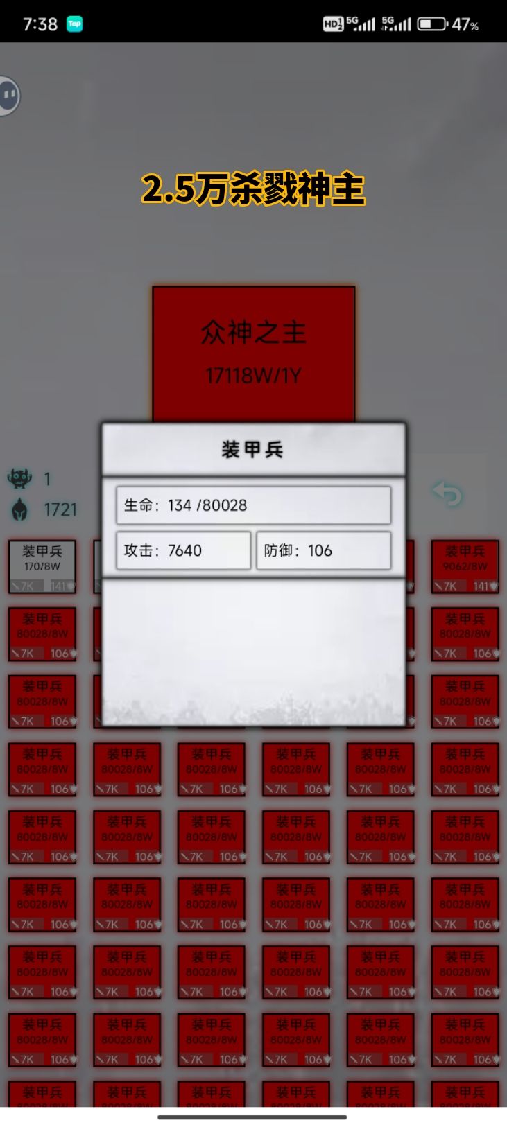 ☆总出战人数2999,神主攻击超8万了,所以说我想把装甲兵血量撑到8万,然后开始打,结果今天试了一下真的可以,但是装甲兵的血量要到8万。攻击7000。