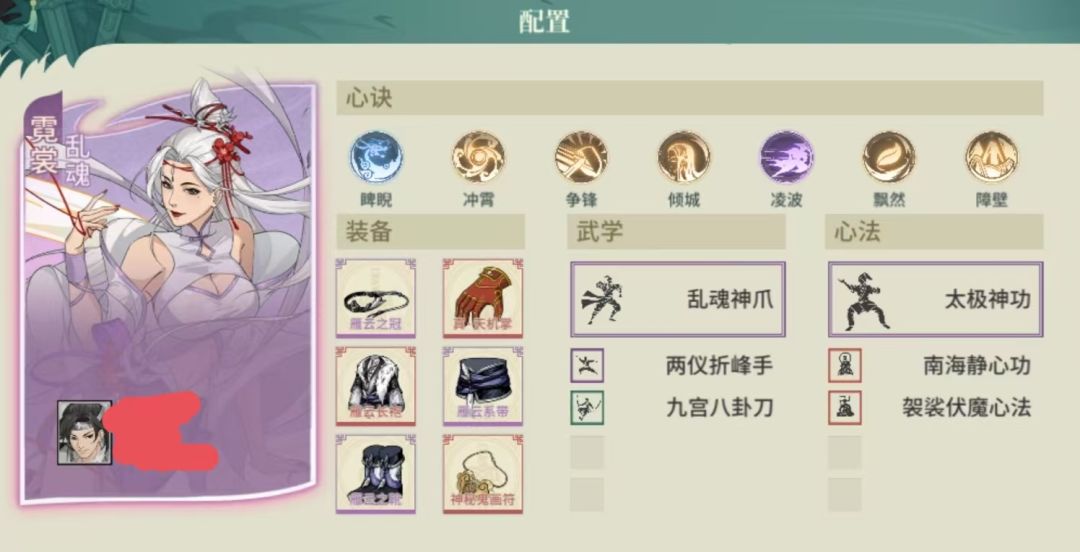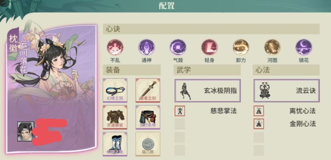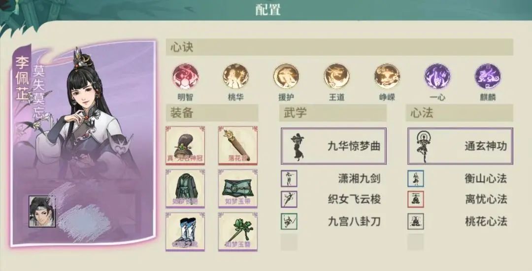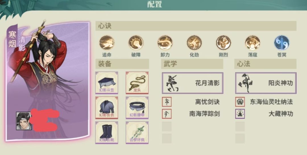 全洗身法,这套总身法207(移动加2),配合业火鞋,达5格移动距离。除了带如梦佩的侠客、张良、妙真、霓裳、桃花、香君等外