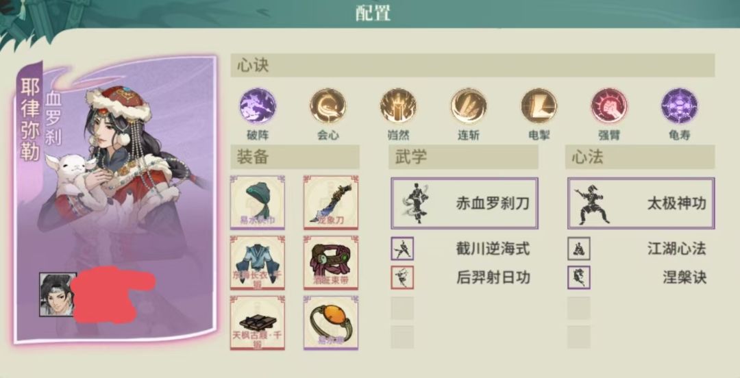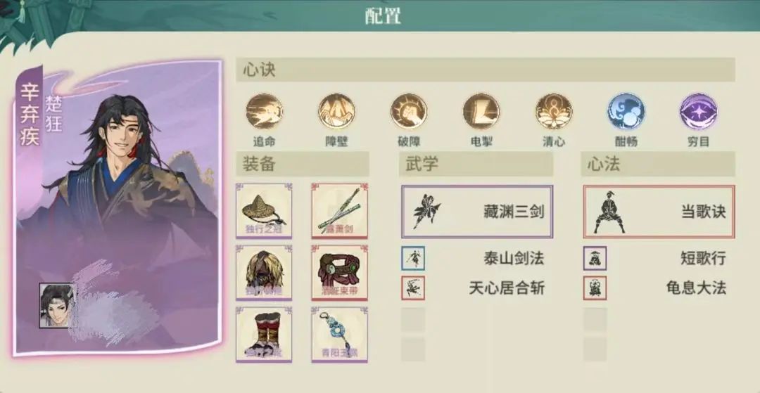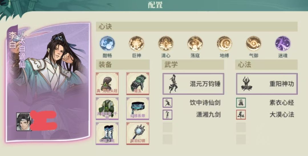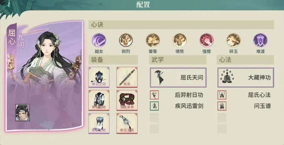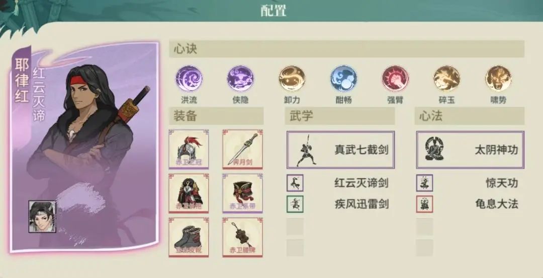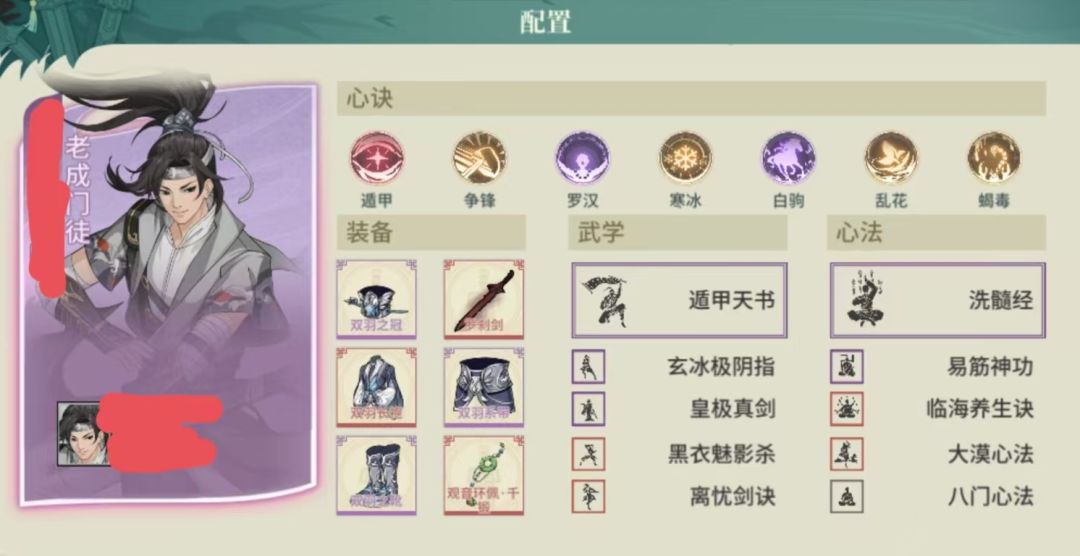 武道选择沉雄悲壮和心意通达(心诀上限+3)。对于第二个武道天赋,主流遁甲应该是选择明玉折光,追求快速刷新冷却。俺一开始也是这么选的,但是在实战中发现,碰上剑意主和输出型侠客,触发不了几次减免冷却的效果,并且生存堪忧。于是选择提升心诀上限,将烈炙换为罗汉。
