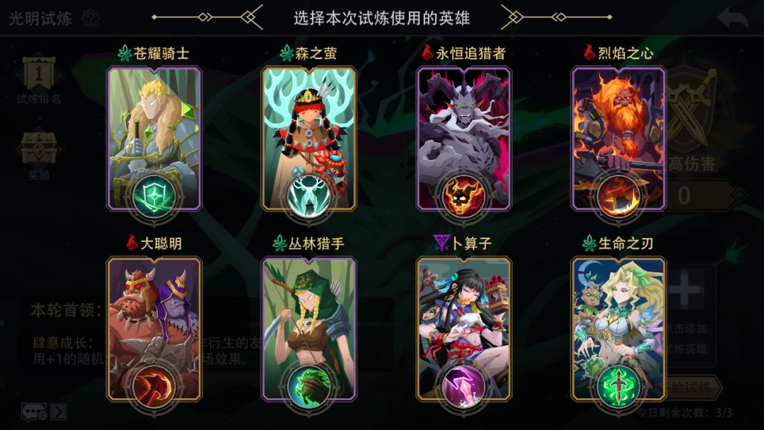 蘑菇补血流:(孢子+树妖+低语者+生命古树+治愈之风等)该常规打法一般可以拿满魔晶奖励,2000分伤害打满需要的条件较高。
